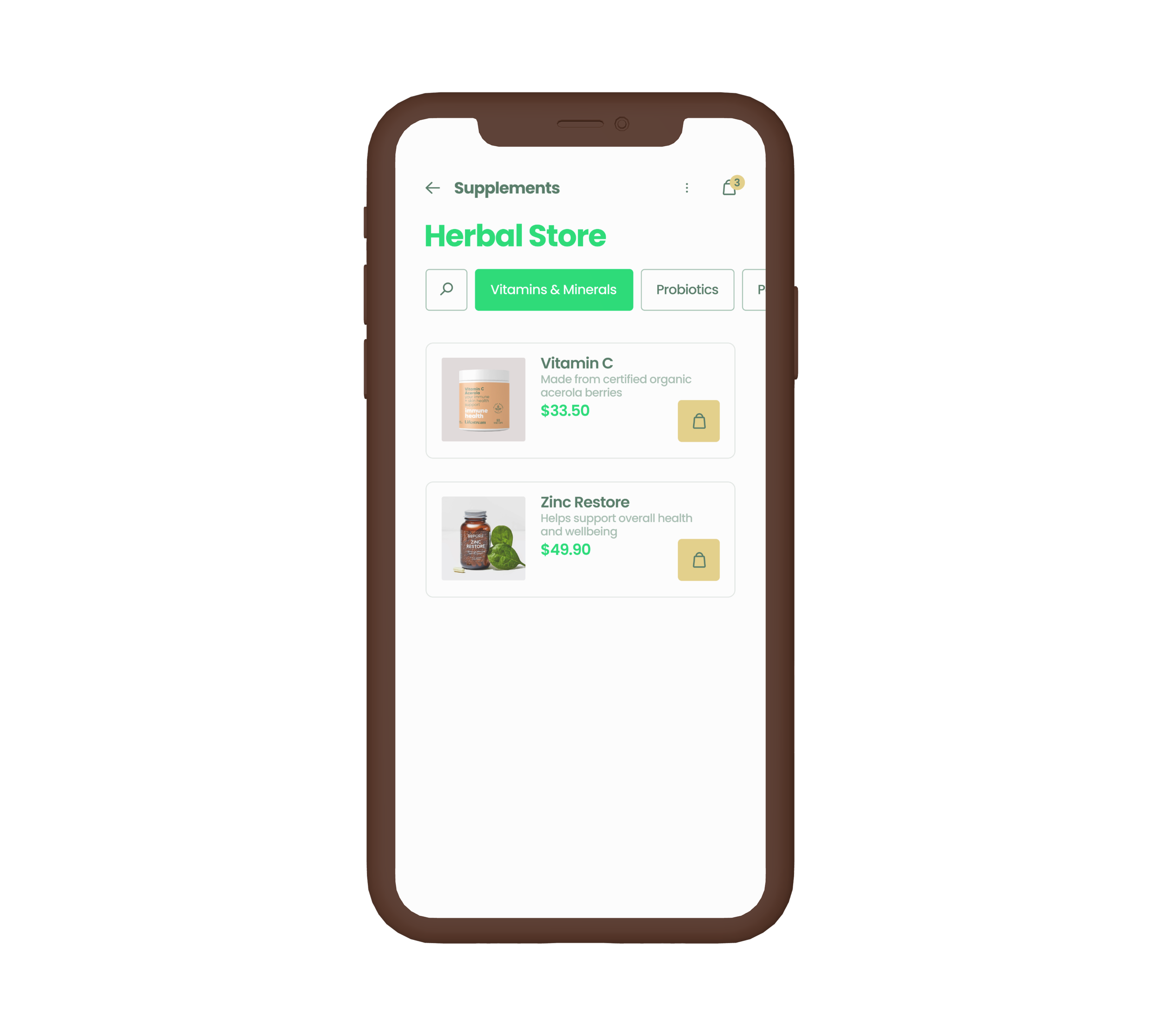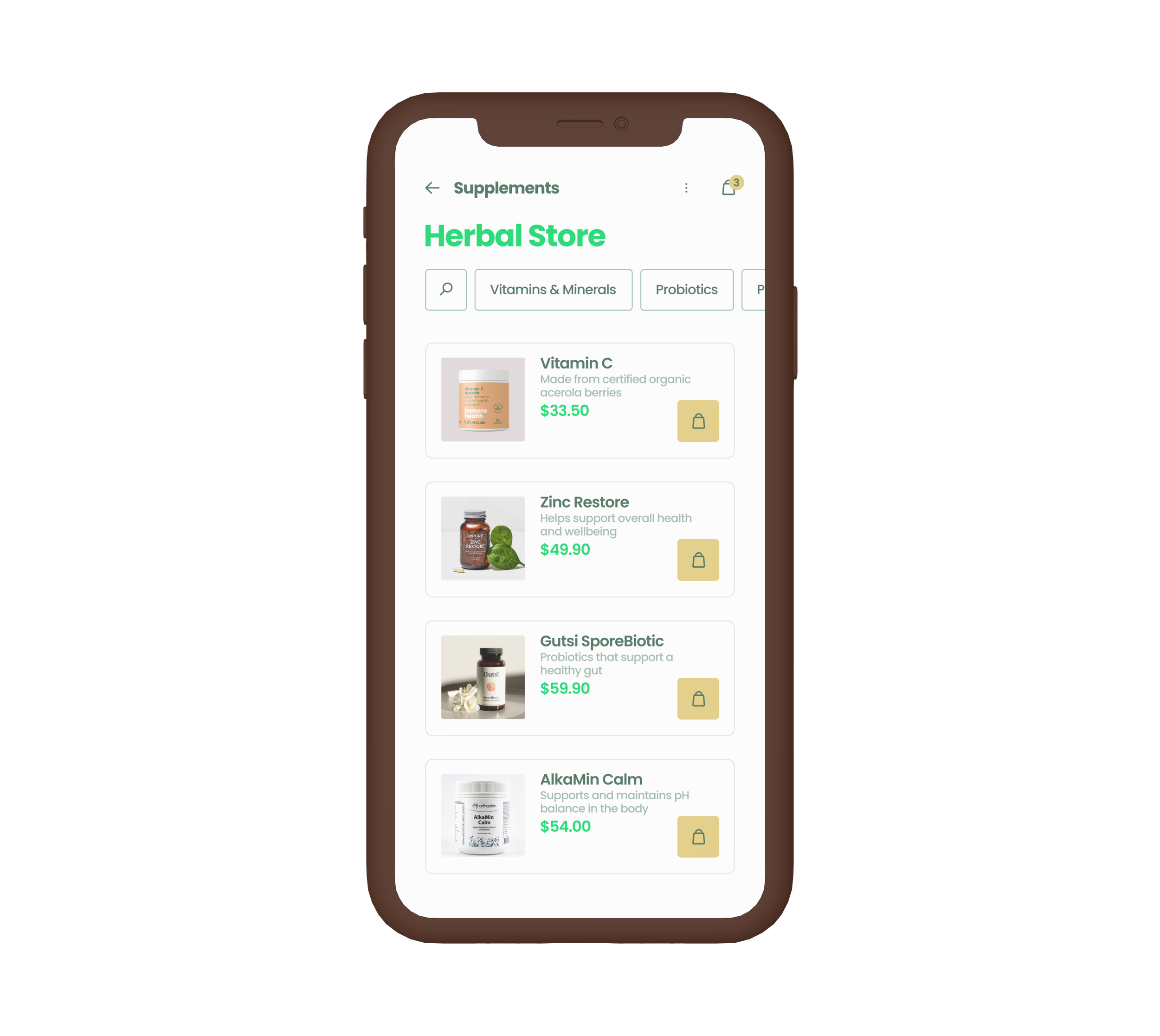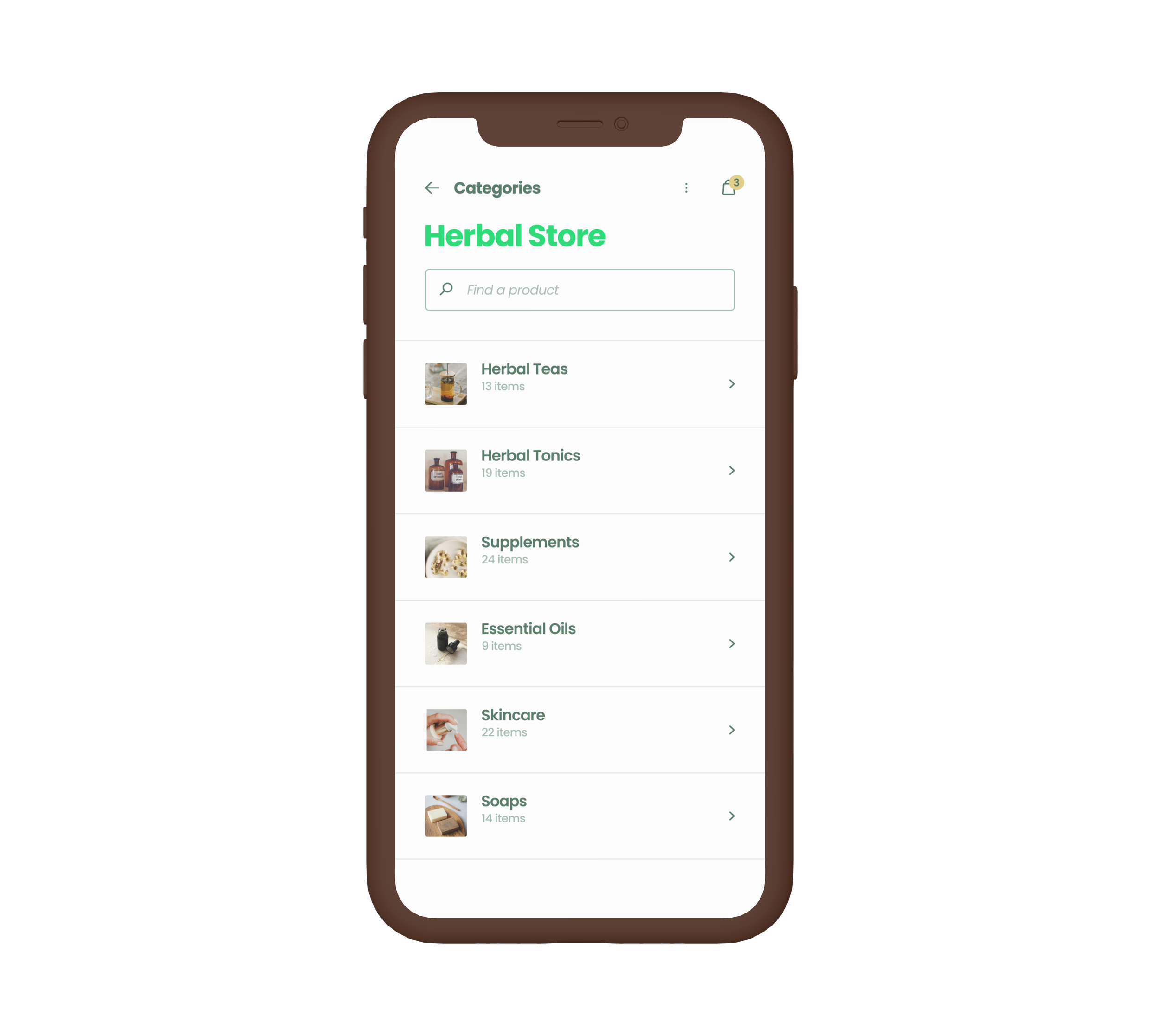 Mobile app concept for a herbal product store, demonstrating user interface design, navigation flow, and cohesive wellness branding.