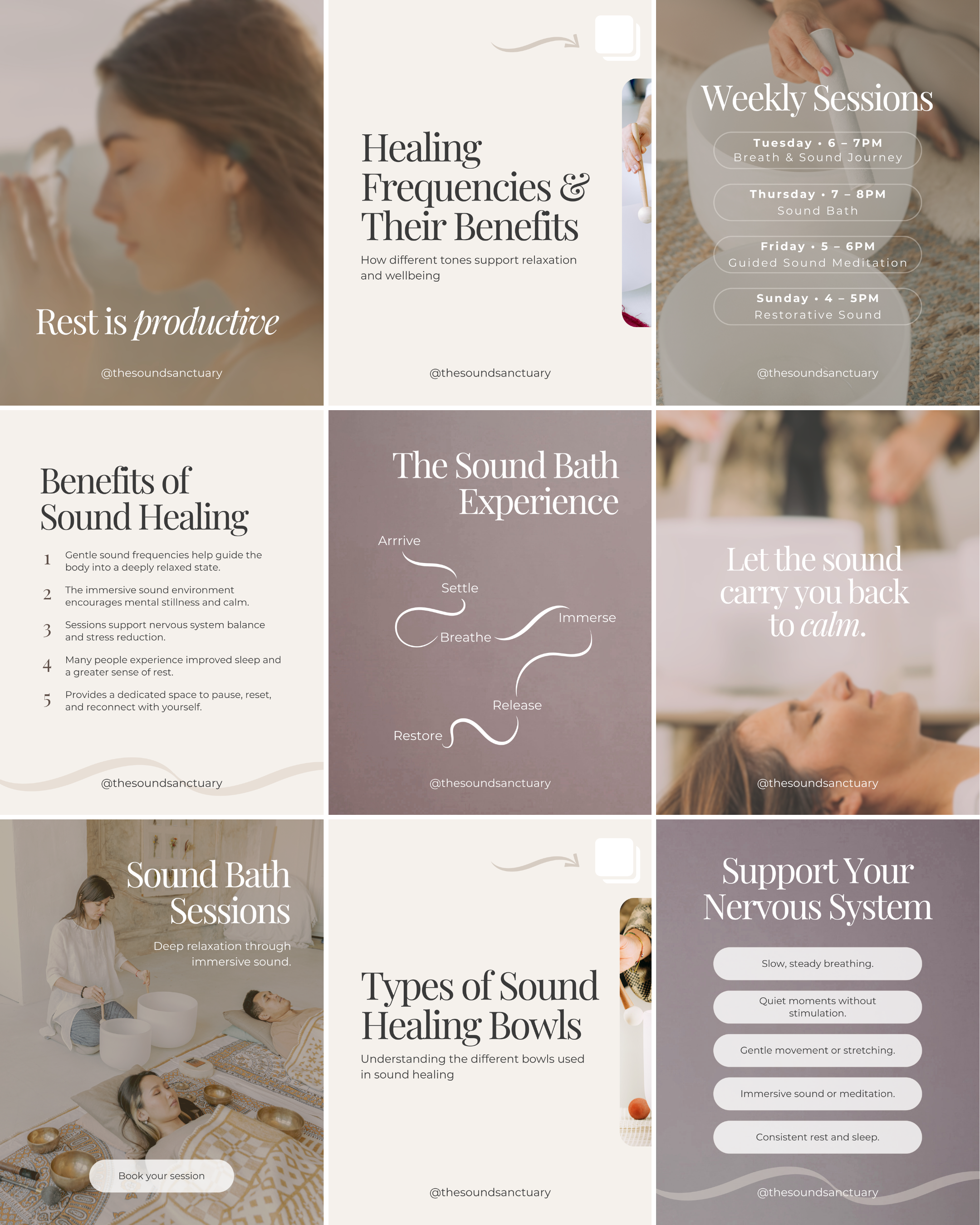A sample Instagram content set created to demonstrate branding, educational graphics, and content layout for a wellness business.